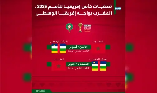 الرباط – يواجه المنتخب المغربي لكرة القدم منتخب إفريقيا الوسطى، يومي 7 و15 أكتوبر المقبلين، بالملعب الشرفي بوجدة، لحساب الجولتين الثالثة والرابعة من تصفيات كأس إفريقيا لكرة القدم المغرب 2025.