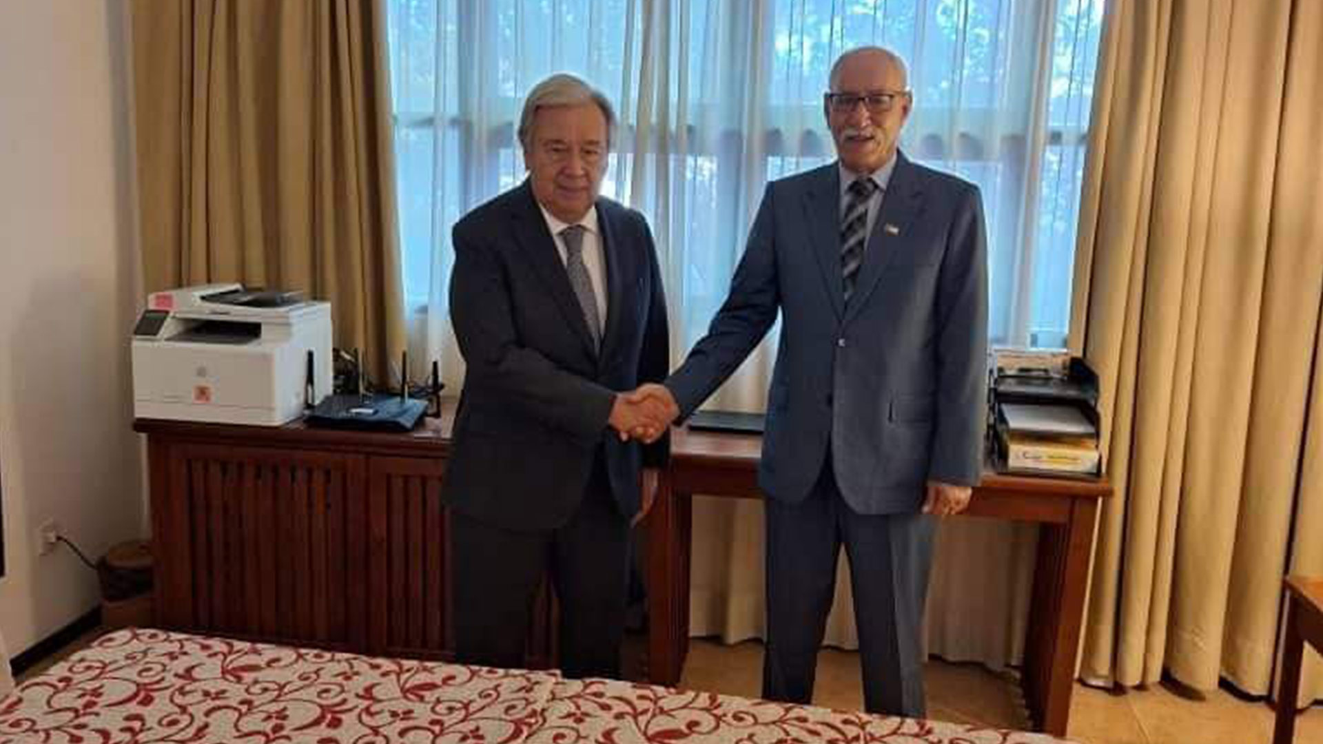 السبب هو كون هذه الصورة تم التقاطها من غرفة نوم الأمين العام للأمم المتحدة، حيث عمل ابراهيم غالي لتسلل كالفأر من أجل انتهاز الفرصة والتقاط الصورة، ملامح غوتيريش ظهرت غير راضية بهذا الأمر خاصة أن ابتسامته المعتادة كانت غائبة، ما يكشف بالملموس على أن الجزائر ودميتها البوليساريو تحاولان بشتى الطرق إظهار هذا الكيان المزعوم، رغم أن أغلبية دول العالم تساند مقترح الحكم الذاتي كحل وحيد لقضية الصحراء المغربية.