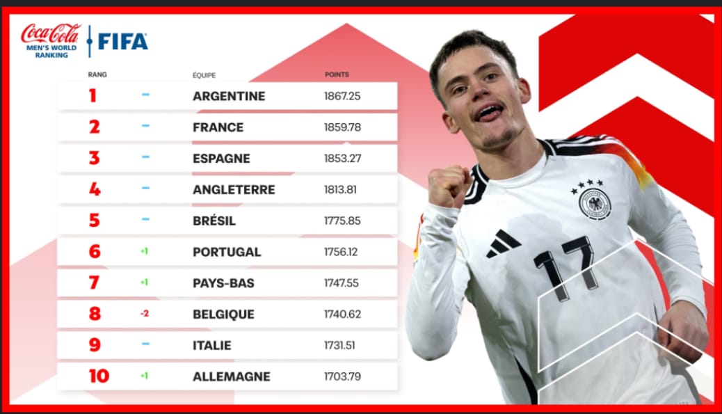 استمر التنافس بين الثلاثي الرائد في التصنيف، حيث حافظت الأرجنتين على المركز الأول، متقدمة بفارق طفيف على فرنسا في المركز الثاني وإسبانيا في المركز الثالث. بينما ظلت إنجلترا (الرابعة) والبرازيل (الخامسة) ثابتتين، حققت البرتغال (السادسة) وهولندا (السابعة) تقدمًا بمركز واحد لكل منهما، في حين تراجعت بلجيكا إلى المركز الثامن بخسارة مركزين. أما ألمانيا فقد عادت إلى المراكز العشرة الأولى، محققة المركز العاشر.