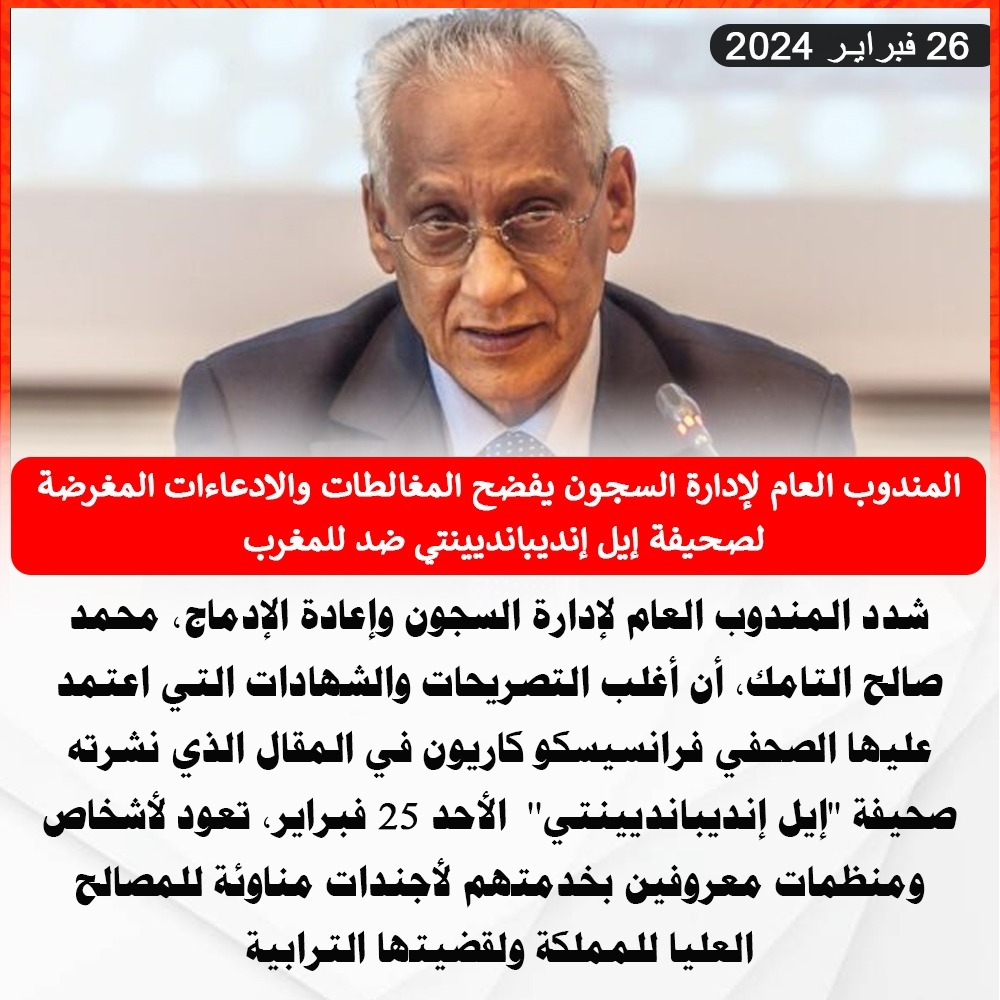 شدد المندوب العام لإدارة السجون وإعادة الإدماج، محمد صالح التامك، أن أغلب التصريحات والشهادات التي اعتمد عليها الصحفي فرانسيسكو كاريون في المقال الذي نشرته صحيفة “إيل إنديبانديينتي” أمس الأحد، تعود لأشخاص ومنظمات معروفين بخدمتهم لأجندات مناوئة للمصالح العليا للمملكة ولقضيتها الترابية.