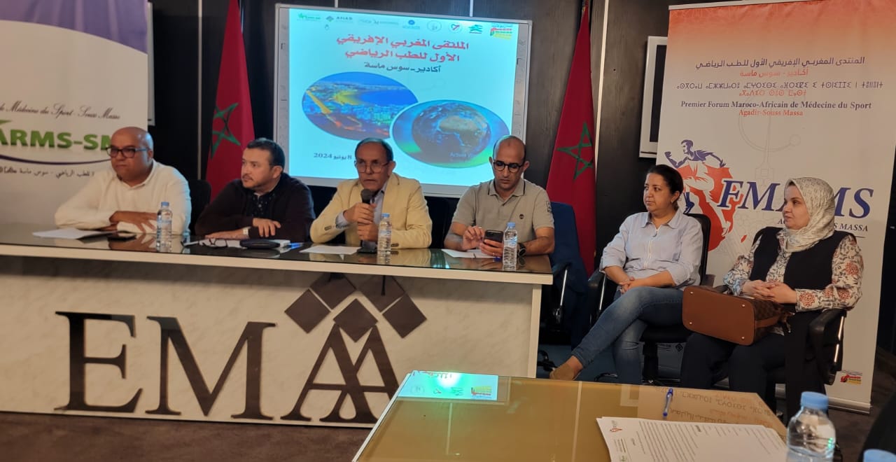عقدت مساء يوم الاثنين 3 يونيو 2024 بمؤسسة EMAA باكادير ندوة صحفية لتسليط الضوء على الملتقى الافريقي المغربي الاول والذي ستستضيفه كلية الطب والصيدلة بأكادير، أيام 6، 7 و8 يونيو 2024، المنظم من طرف الجمعية الجهوية للطب الرياضي سوس ماسة، بشراكة مع الجمعية المغربية للصحافة الرياضية، ومؤسسة محمد السادس للعلوم والصحة، والوكالة المغربية لمكافحة المنشطات، وجمعية جراحة وتقويم العظام بالجنوب، والجمعية المغربية لأمراض القلب والشرايين، وأكاديمية ميشيل فيلاكورتا، وكلية الطب والصيدلة بأكادير والأكاديمية المغربية للمرافقة الذهنية والرياضية والجمعية الوطنية لمصوري الصحافة الرياضية، وحسب المتدخلين في الندوة باعتبارهم اعضاء اللجنة التنظيمية فان الملتقى يهدف الى تعزيز مكانة الطب الرياضي في منظومة الصحة العامة للرياضيين، والتأكيد على أن الرياضة في حد ذاتها هي غاية لتحقيق الرفاهية والتنمية البشرية. كما تم التدكير بمواضيع الورشات التخصصية في مجالات تتصل بالطب الرياضي والتأهيل الذهني والتوعية بأهمية الطب الرياضي من خلال الإعلام المتخصص